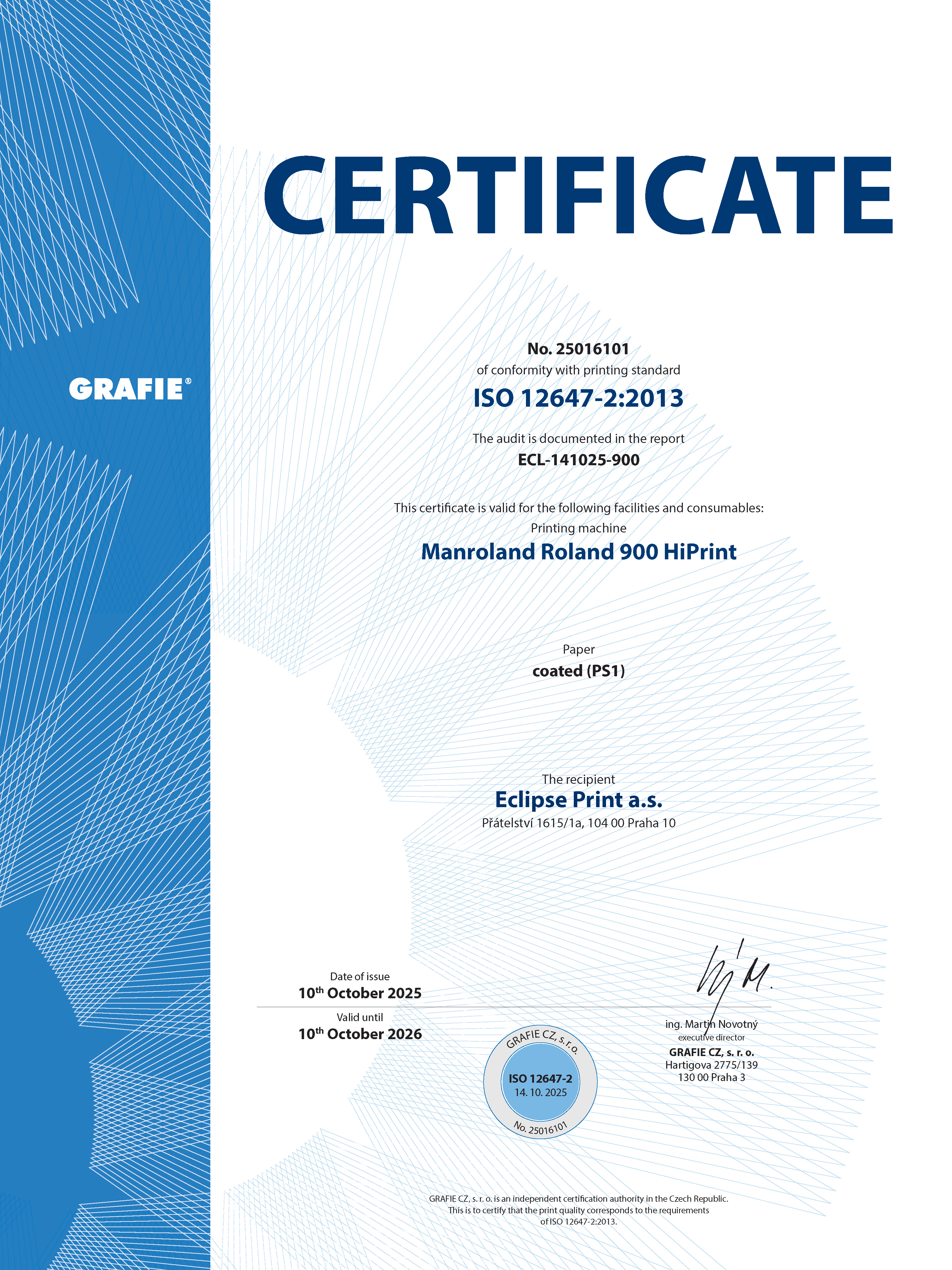 Our printing facility has successfully achieved ISO 12647-2:2013 certification for coated material (PS1) on our Manroland ROLAND 900 press, confirming that we deliver top-quality prints with precise and consistent colours.